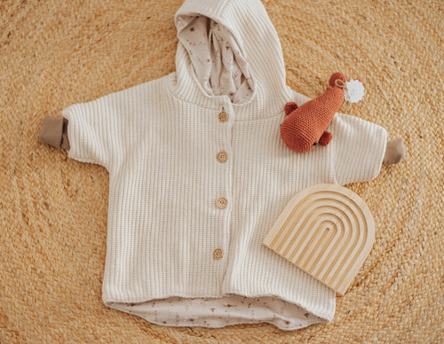 Oversized Jacke mit Kapuze – Strickstoff – Blumenjersey Futter – Holzknöpfe – Größe 68 – Handgemacht